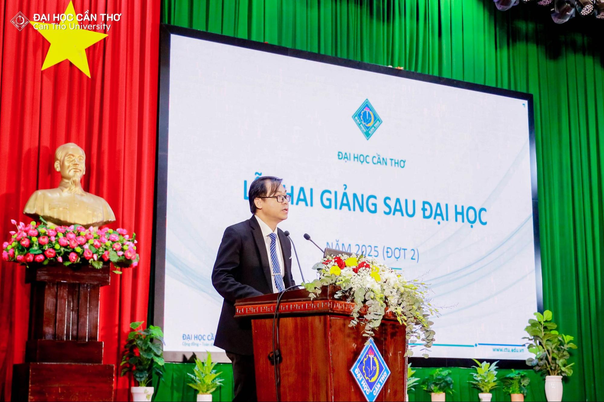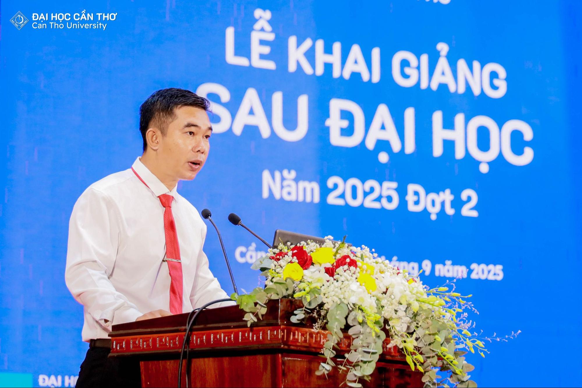 Phát biểu tại buổi lễ, GS.TS. Nguyễn Thanh Phương gửi lời chúc mừng đến các tân học viên và nghiên cứu sinh, đồng thời nhấn mạnh: “Quyết định theo học trình độ sau đại học không chỉ đơn thuần là một lựa chọn học tập, mà còn là sự cam kết đối với chính bản thân mình đó là phải kiên trì, nỗ lực để nâng cao tri thức cho bản thân, góp phần để tạo dựng giá trị mới cho cộng đồng và xã hội. Nhà trường luôn mong muốn các tân học viên và nghiên cứu sinh luôn học tập với tinh thần chủ động, tích cực sáng tạo và trách nhiệm; đồng thời, hãy luôn giữ vững đạo đức trong nghiên cứu, trung thực trong học thuật, và gắn kết tri thức với thực tiễn đời sống. ĐHCT sẽ luôn cố gắng trong công tác giảng dạy và nghiên cứu, tạo các mọi điều kiện thuận lợi cho tân học viên và nghiên cứu sinh trong học tập. Chúng tôi xác định xây dựng môi trường giáo dục mang tính khai phóng, đó là môi trường học thuật cởi mở, hiện đại; hỗ trợ tối đa trong nghiên cứu và công bố khoa học; tìm kiếm sự kết nối rộng rãi với doanh nghiệp, tổ chức trong và ngoài nước.”