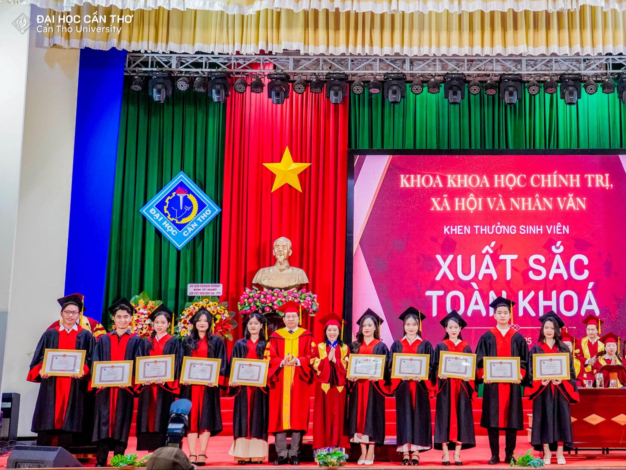 Đồng chí Lê Nguyễn Hải Đăng - Phó Bí thư Bí thư Đoàn TNCS Hồ Chí Minh, Phó Chủ tịch Hội sinh viên ĐHCT trao giấy khen cho các sinh viên có thành tích xuất sắc toàn khóa trong hoạt động Đoàn và Phong trào thanh niên