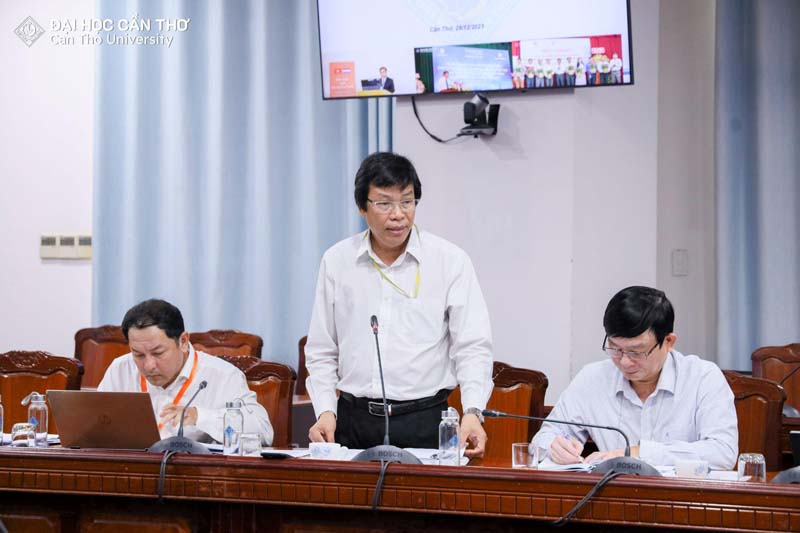 PGS.TS. Trần Trung Tính, Hiệu trưởng, ghi nhận các ý kiến đóng góp và đánh giá cao các kết quả đạt được trong năm 2023. Hiệu trưởng đề nghị, cần quan tâm hơn nữa về chuyển giao công nghệ; tăng cường tập huấn công tác văn phòng về KHCN và HTQT; NCKH luôn song hành với công bố khoa học, xác lập quyền sở hữu trí tuệ; phân tích nhu cầu của các đoàn khách quốc tế khi đến Trường ĐHCT. Đồng thời, trong thời gian tới, cần tăng cường công tác kiểm tra, giám sát, đánh giá kết quả sau khi nghiệm thu chất lượng, hiệu quả các đề tài, dự án; xây dựng và phát triển phòng thí nghiệm trở thành phòng nghiên cứu R&D (Research and Development) cho doanh nghiệp và phục vụ cho các công tác thí nghiệm, nghiên cứu khoa học cho giảng viên, sinh viên trong toàn trường.