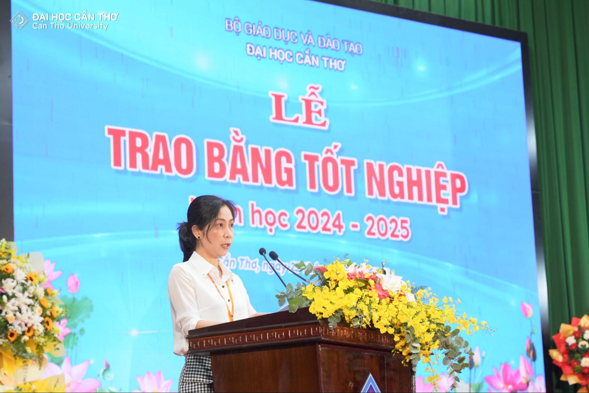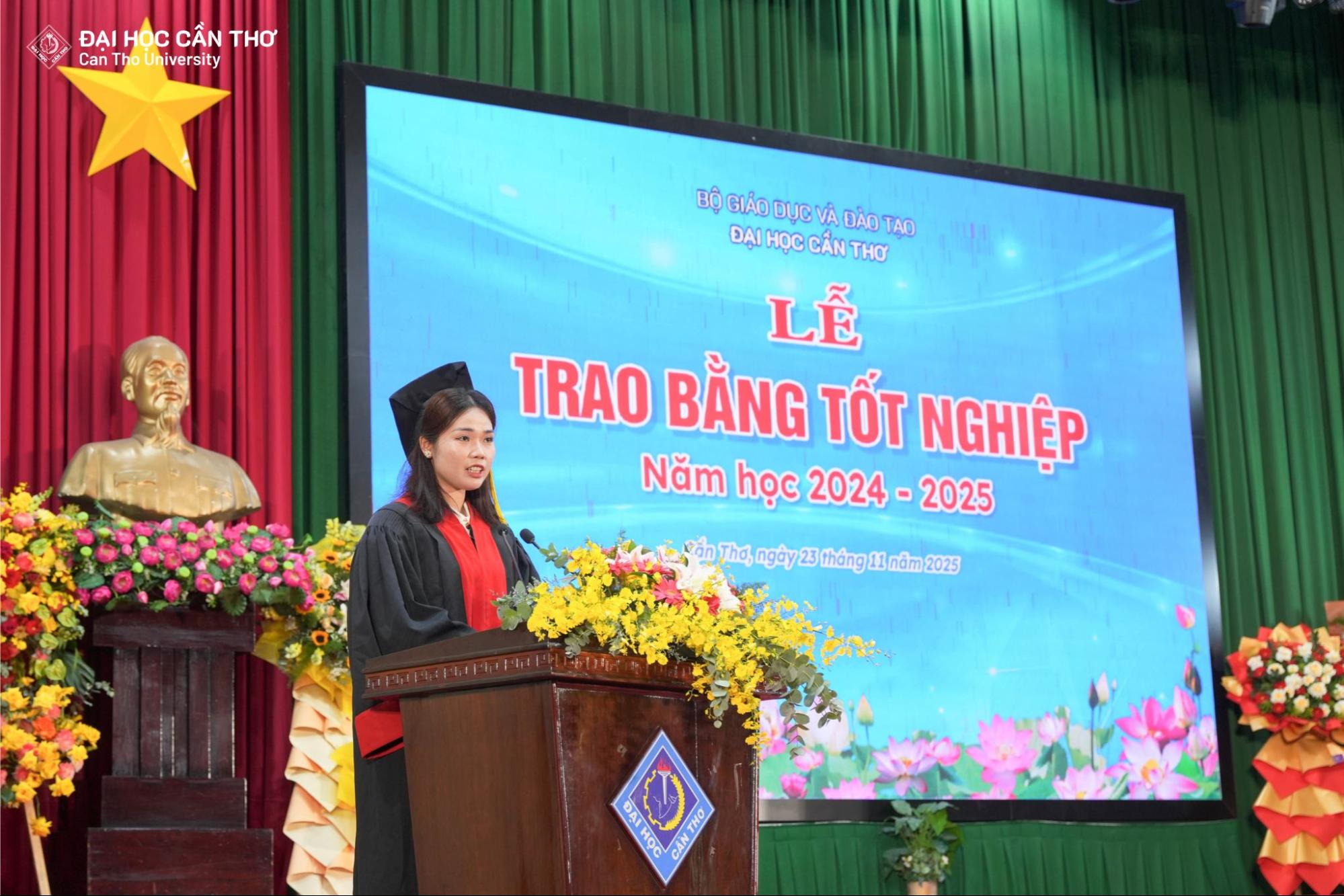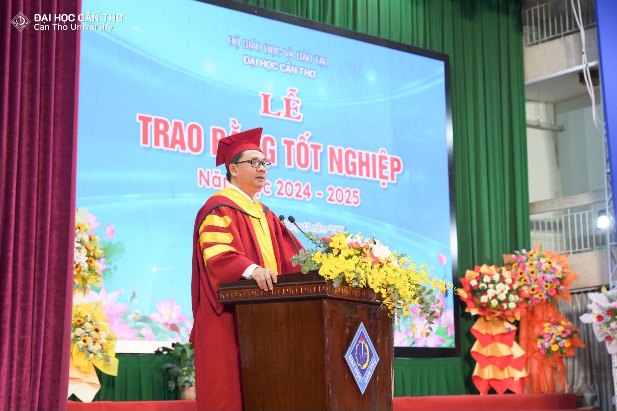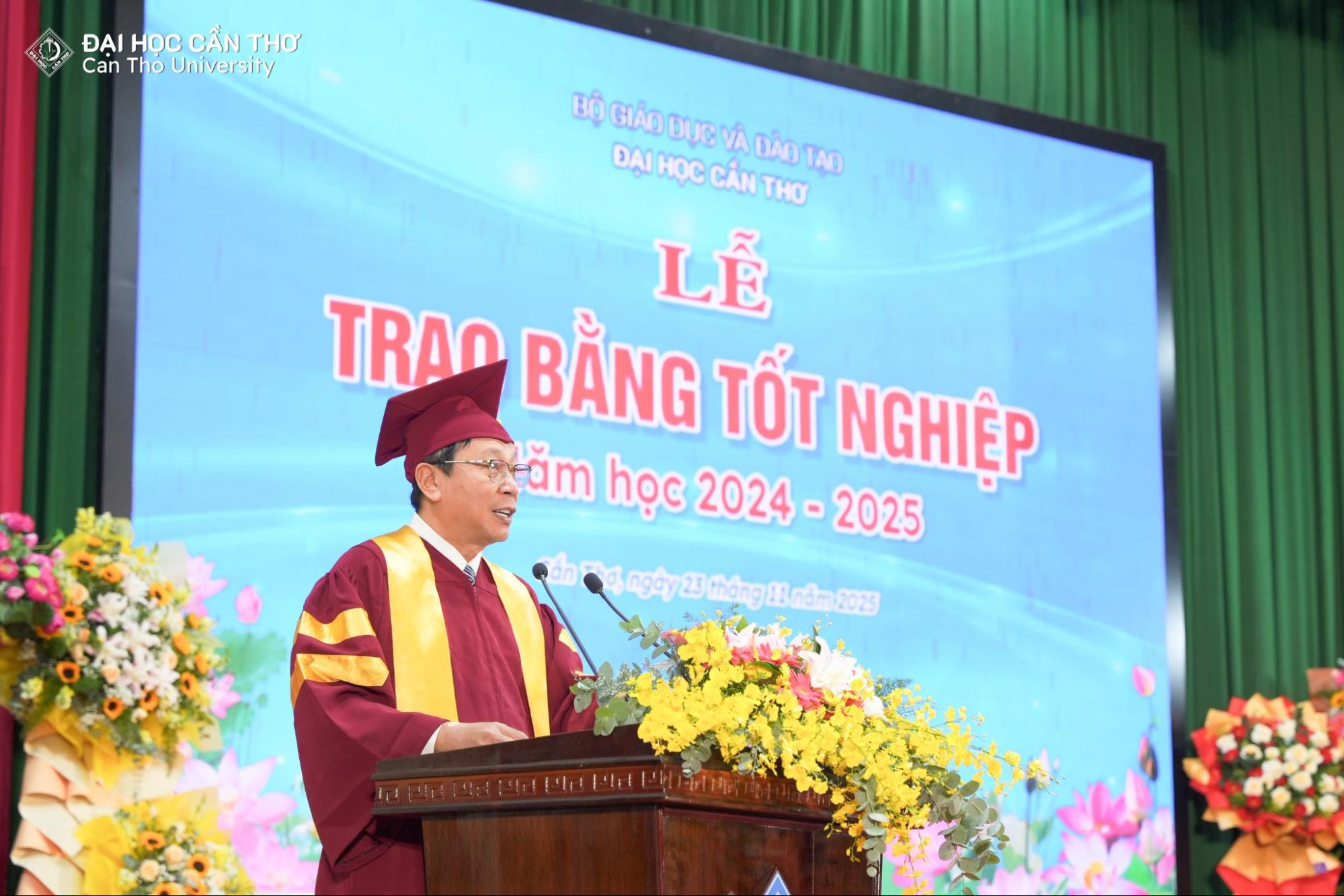 Phát biểu tại chương trình, GS. TS. Nguyễn Chí Ngôn đã gửi lời chúc mừng và bày tỏ niềm tự hào trước những nỗ lực bền bỉ cùng những thành tựu đáng ghi nhận mà các tân khoa đã đạt được trong suốt quá trình học tập tại ĐHCT. Phó Chủ tịch Hội đồng Trường cũng bày tỏ sự trân trọng đối với các đơn vị liên kết đào tạo đã đồng hành, hỗ trợ hiệu quả cả về chuyên môn lẫn điều kiện học tập cho người học, đồng thời GS. TS. Nguyễn Chí Ngôn cũng gửi lời tri ân đến các mạnh thường quân và doanh nghiệp đã phối hợp cùng Nhà trường trong công tác đào tạo và kỳ vọng sẽ tiếp tục nhận được sự hỗ trợ từ các đơn vị, góp phần thúc đẩy hoạt động đào tạo liên tục phát triển mạnh mẽ hơn trong thời gian tới.