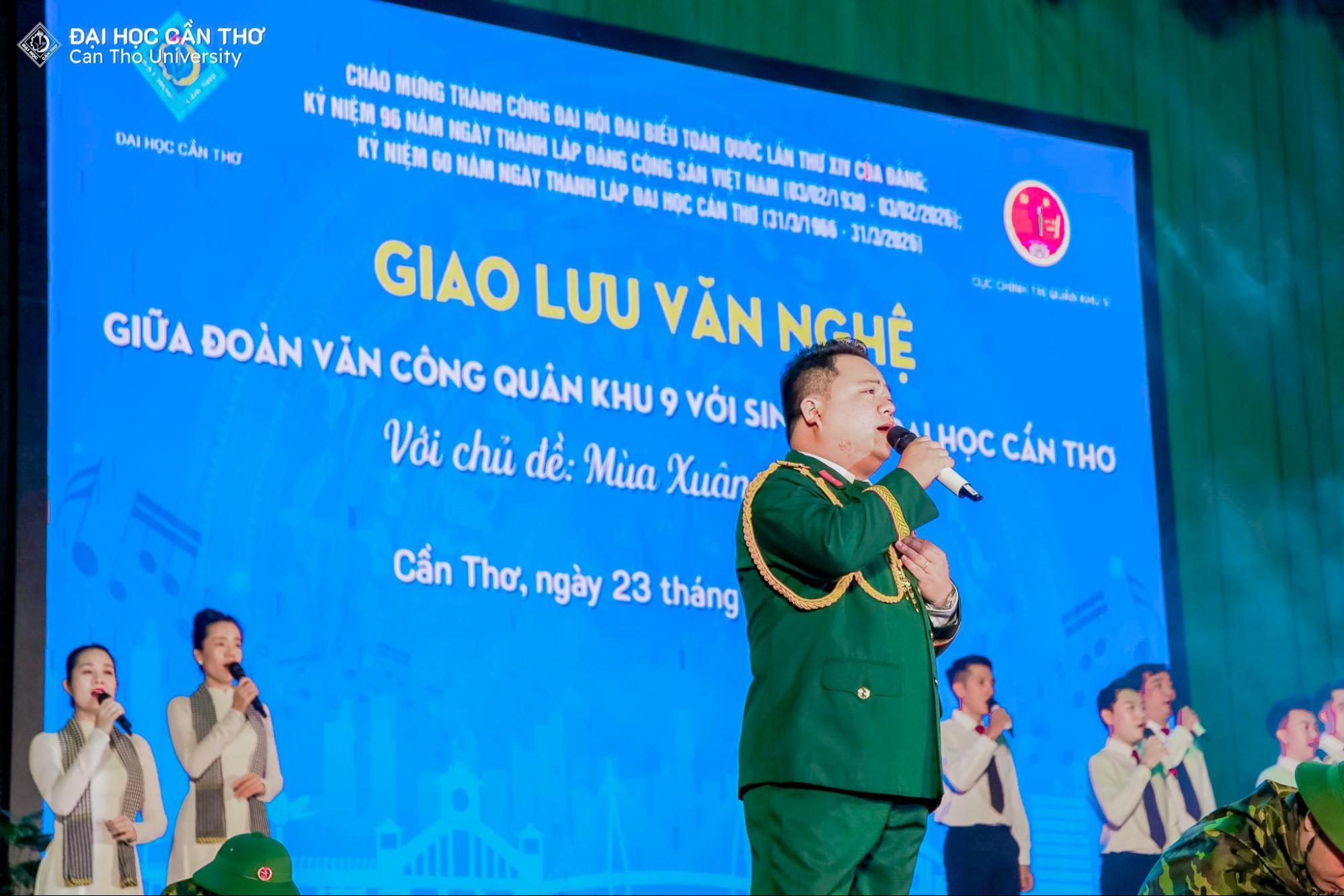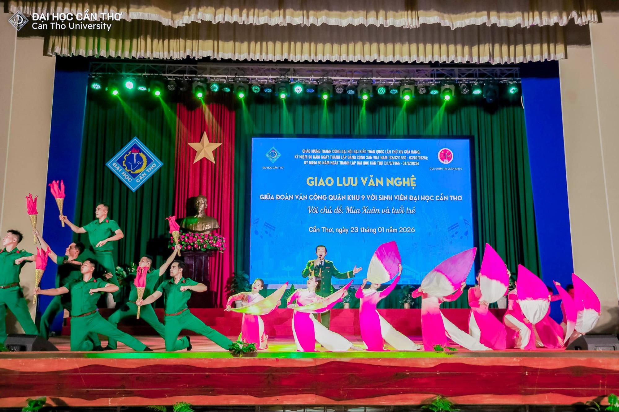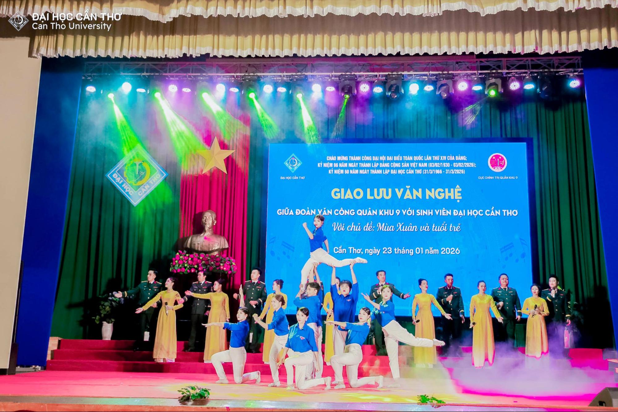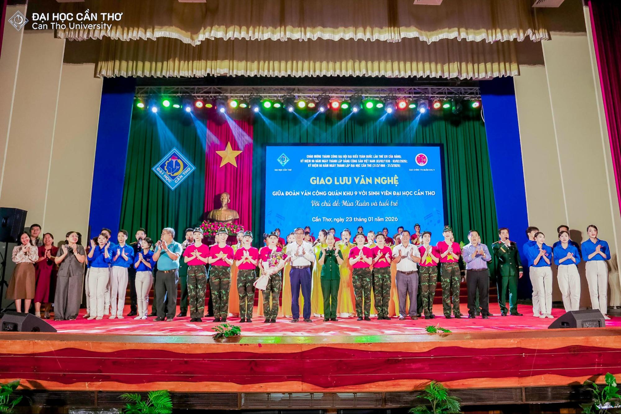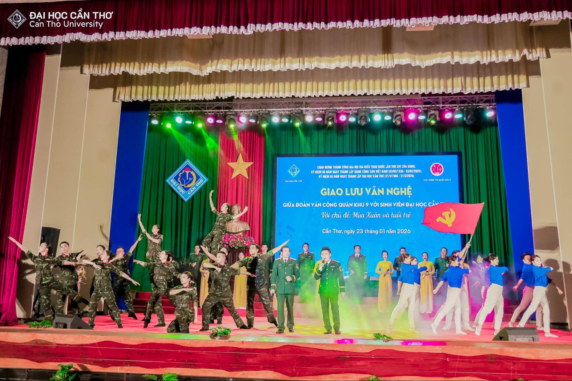 Nhằm chào mừng thành công Đại hội đại biểu toàn quốc lần thứ XIV của Đảng Cộng sản Việt Nam, hướng tới kỷ niệm 96 năm Ngày thành lập Đảng (03/02/1930 – 03/02/2026), 60 năm Ngày thành lập Đại học Cần Thơ (31/3/1966 - 31/3/2026) và đón chào Xuân Bính Ngọ 2026, tối ngày 23/01/2026 tại Hội trường Rùa, Đại học Cần Thơ (ĐHCT) phối hợp cùng Cục Chính trị Quân khu 9 tổ chức chương trình giao lưu văn nghệ với chủ đề “Mùa xuân và Tuổi trẻ”.
