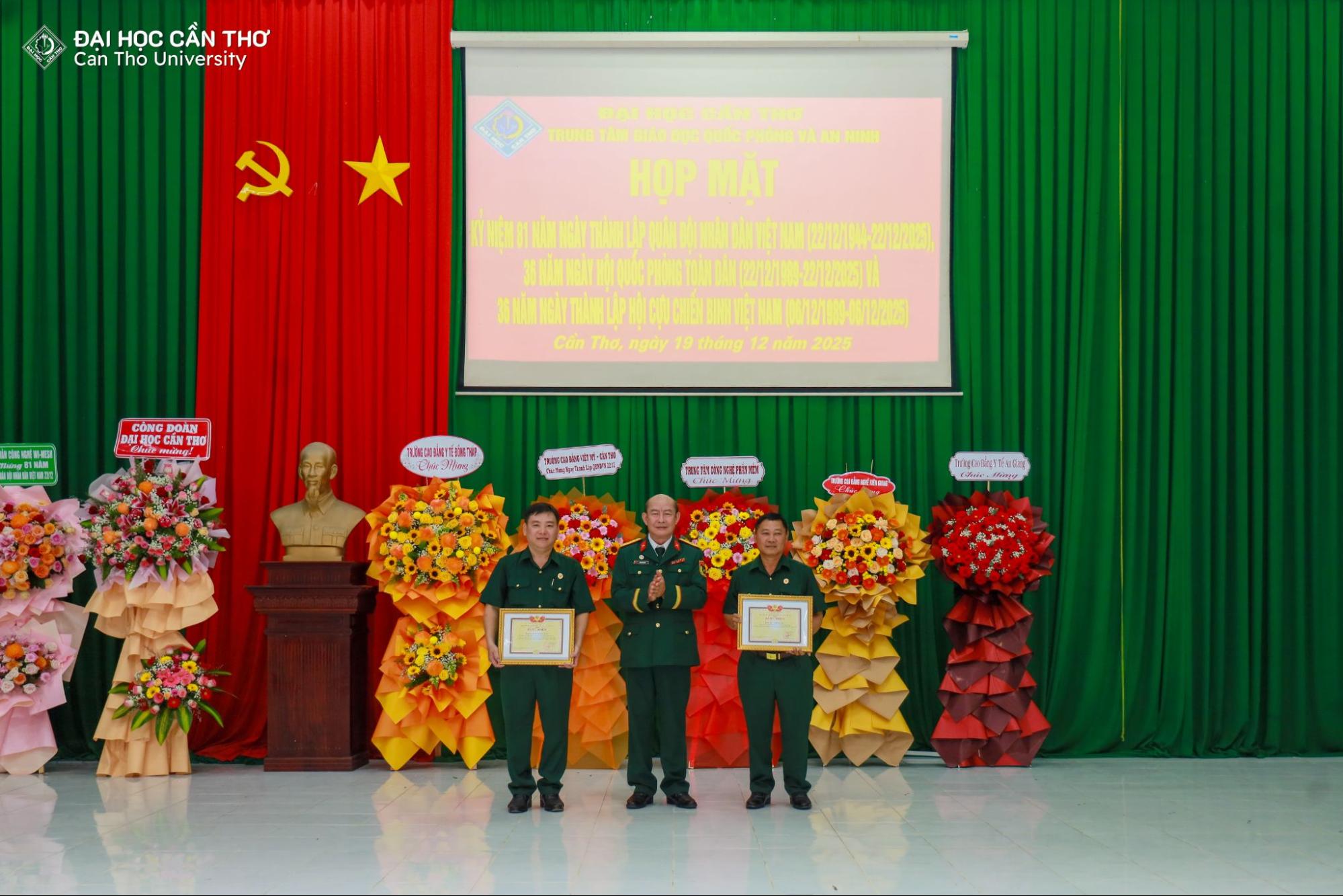 Chiều ngày 19/12/2025, Trung tâm Giáo dục Quốc phòng và An ninh – Đại học Cần Thơ (ĐHCT) đã long trọng tổ chức buổi “Họp mặt kỷ niệm 81 năm Ngày thành lập Quân đội Nhân dân Việt Nam (22/12/1944 – 22/12/2025), 36 năm Ngày hội Quốc phòng toàn dân (22/12/1989 – 22/12/2025) và 36 năm Ngày truyền thống Hội Cựu chiến binh Việt Nam (06/12/1989 – 06/12/2025)”. Chương trình được tổ chức trong không khí trang nghiêm, ấm áp và đầy tự hào, hòa cùng khí thế thi đua sôi nổi của toàn Đảng, toàn dân và toàn quân hướng tới các ngày lễ lớn của đất nước, đồng thời là dịp ý nghĩa để ôn lại truyền thống anh hùng, vẻ vang của Quân đội Nhân dân Việt Nam và các thế hệ Cựu chiến binh (CCB) qua các thời kỳ.