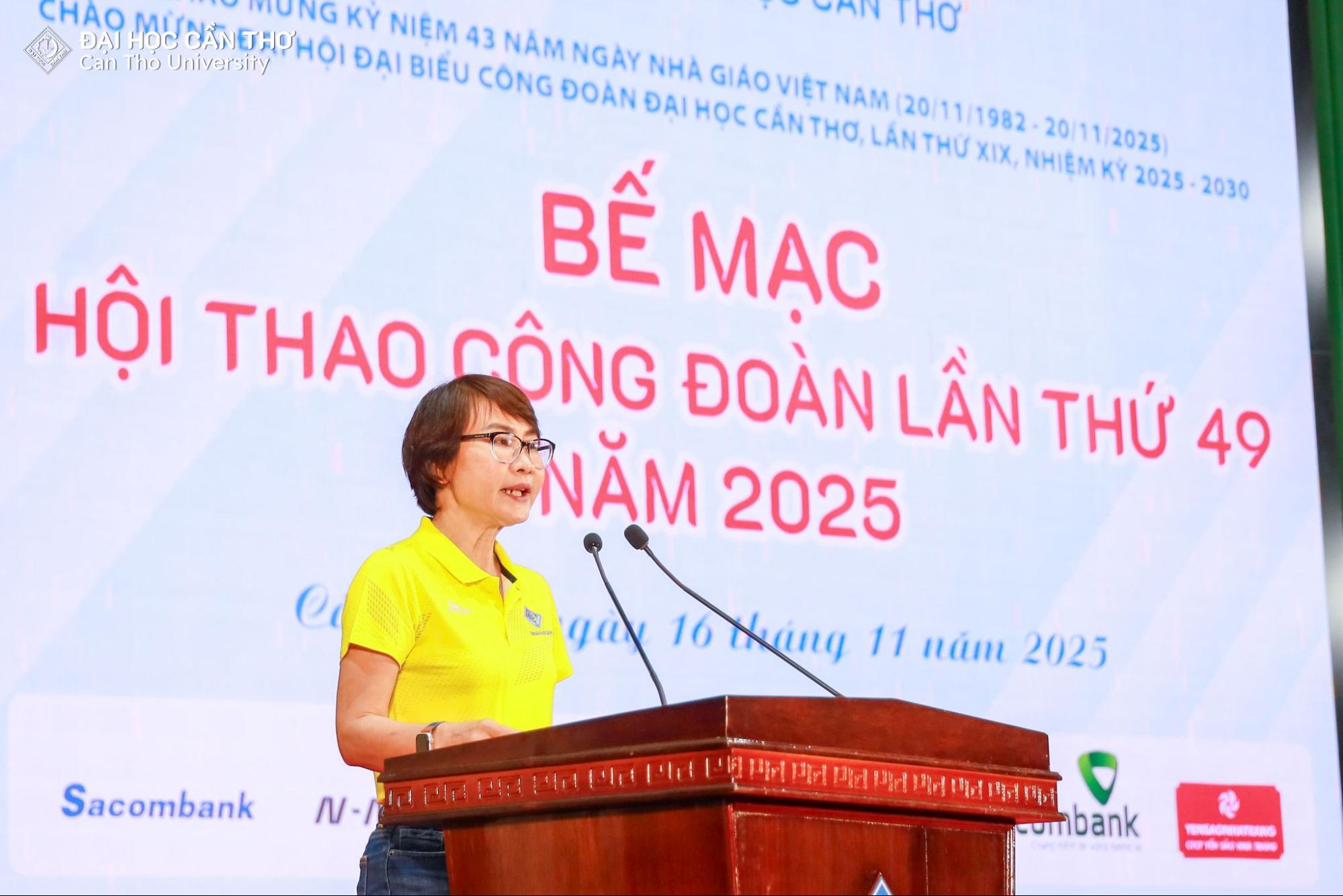 Phát biểu tại buổi lễ, ThS. Dương Thị Tuyền nhấn mạnh: Hội thao truyền thống là hoạt động ý nghĩa nhằm tạo sân chơi lành mạnh, khuyến khích phong trào rèn luyện thể dục thể thao và tăng cường sự gắn kết trong đội ngũ viên chức, người lao động. Chủ tịch Công đoàn gửi lời cảm ơn đến các vận động viên đã tham gia nhiệt tình, lực lượng trọng tài và các bộ phận phục vụ đã làm việc trách nhiệm, cùng các đơn vị đồng hành đã hỗ trợ tích cực để Hội thao diễn ra thành công. Đồng thời, Chủ tịch mong rằng tinh thần rèn luyện thể thao sẽ tiếp tục được lan tỏa, góp phần xây dựng môi trường làm việc năng động, đoàn kết và tràn đầy năng lượng trong toàn ĐHCT.