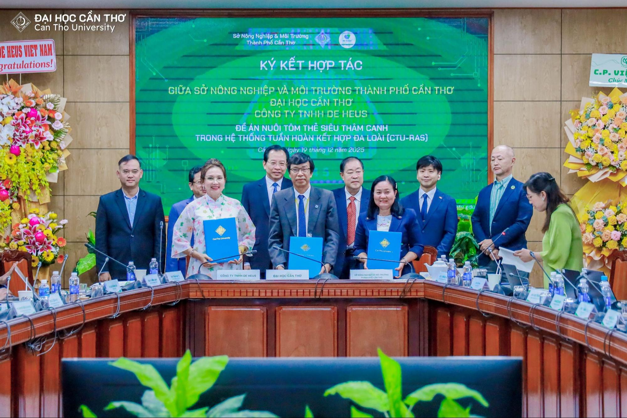 ĐHCT ký kết hợp tác cùng Sở Nông nghiệp và Môi trường thành phố Cần Thơ và Công ty TNHH De Heus về triển khai Đề án Nuôi tôm siêu thâm canh trong hệ thống tuần hoàn kết hợp đa loài – CTU-RAS