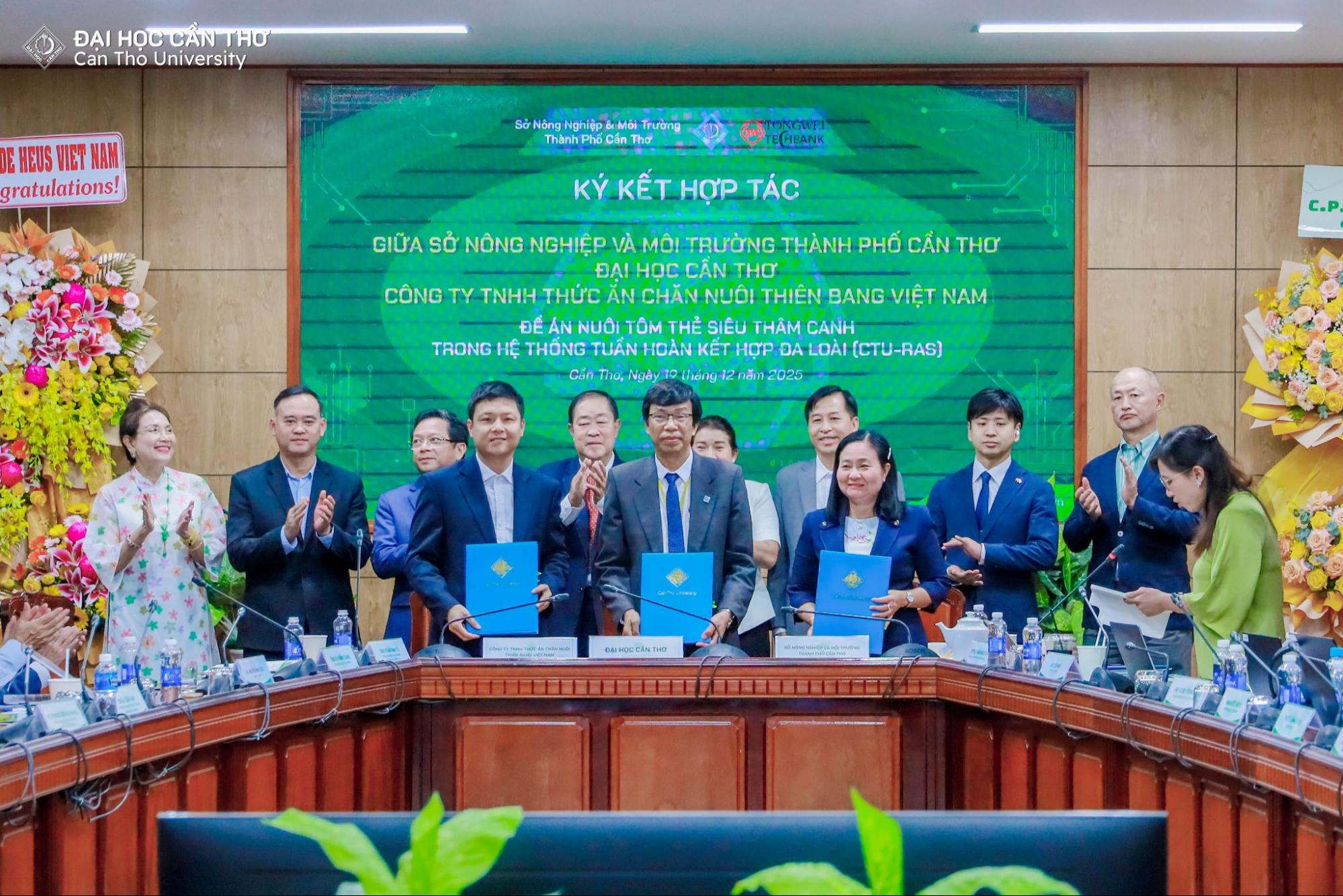 ĐHCT ký kết cùng Sở Nông nghiệp và Môi trường thành phố Cần Thơ và Công ty TNHH Thức ăn chăn nuôi Thiên Bang Việt Nam về triển khai Đề án Nuôi tôm siêu thâm canh CTU-RAS