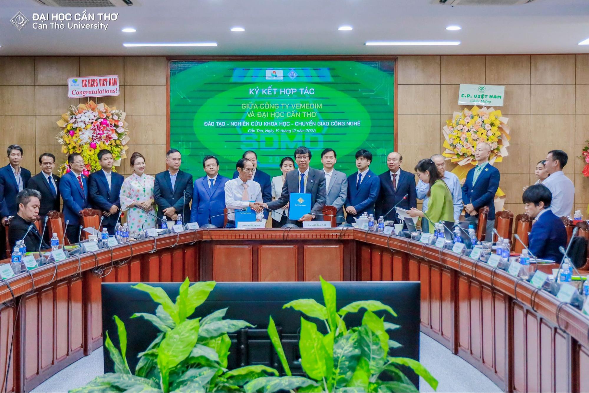 ĐHCT ký kết cùng Trung tâm Nghiên cứu & Phát triển VEMEDIM về phối hợp trong nghiên cứu và phát triển chế phẩm sinh học trong lĩnh vực thú y, cũng như hợp tác nghiên cứu chuyên sâu, góp phần thúc đẩy chuyển giao kết quả nghiên cứu khoa học vào thực tiễn sản xuất