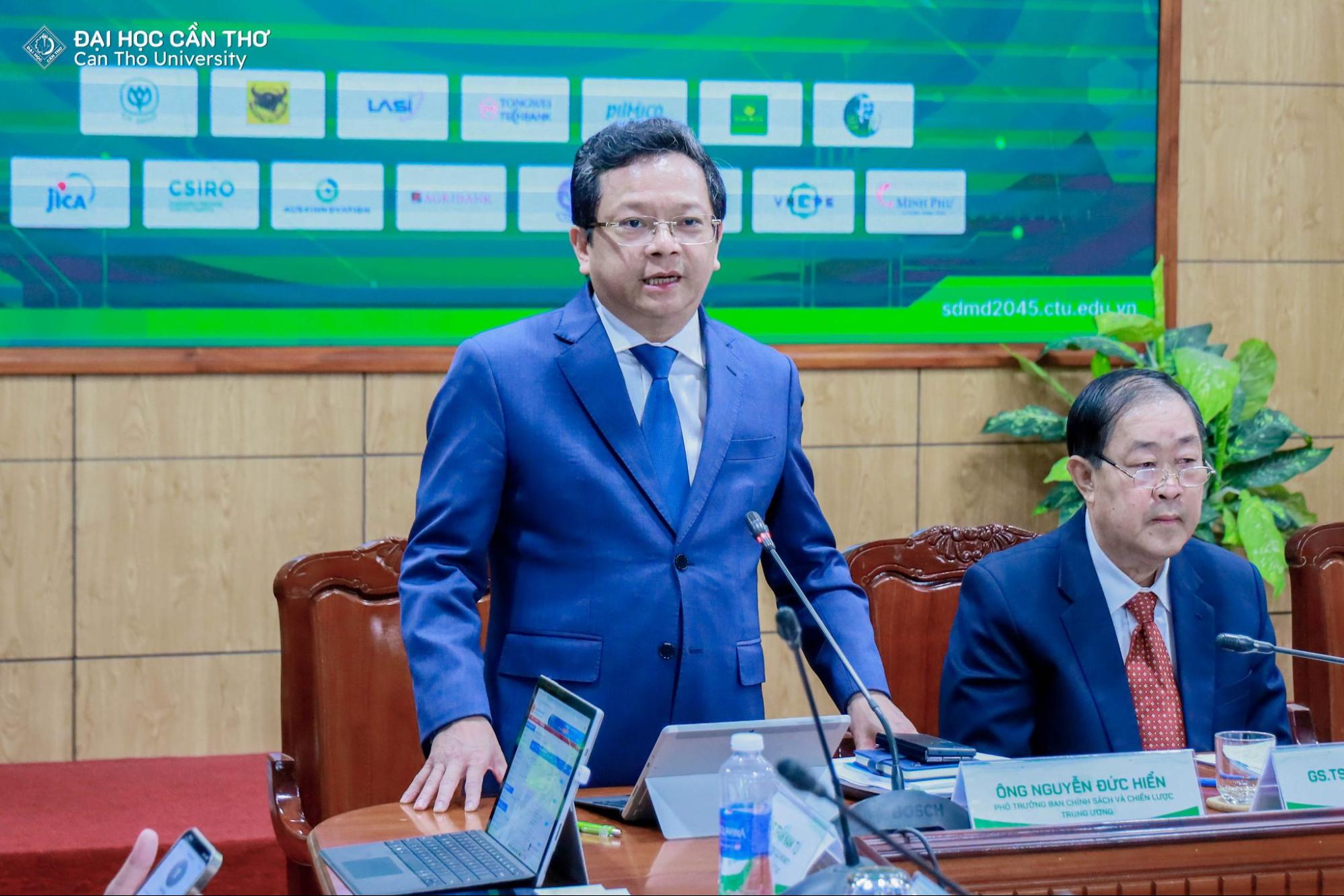Ông Nguyễn Đức Hiển tham luận với chủ đề: “Chiến lược và động lực cho phát triển Khoa học công nghệ – Đổi mới sáng tạo – Chuyển đổi số ở Đồng bằng sông Cửu Long”