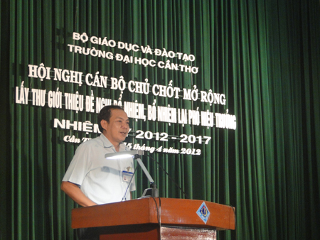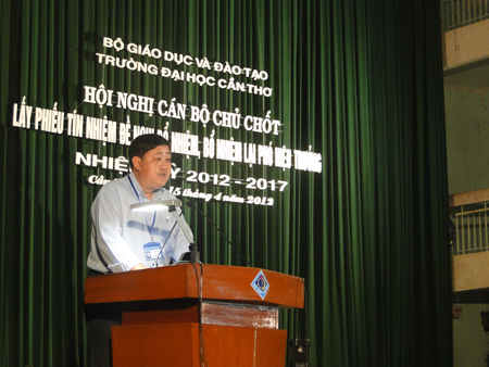 PGS.TS Hà Thanh Toàn, Hiệu trưởng Trường ĐHCT phát biểu tại "Hội nghị cán bộ chủ chốt lấy phiếu tín nhiệm đề nghị bổ nhiệm, bổ nhiệm lại Phó Hiệu trưởng Trường ĐHCT nhiệm kỳ 2012-2017" |