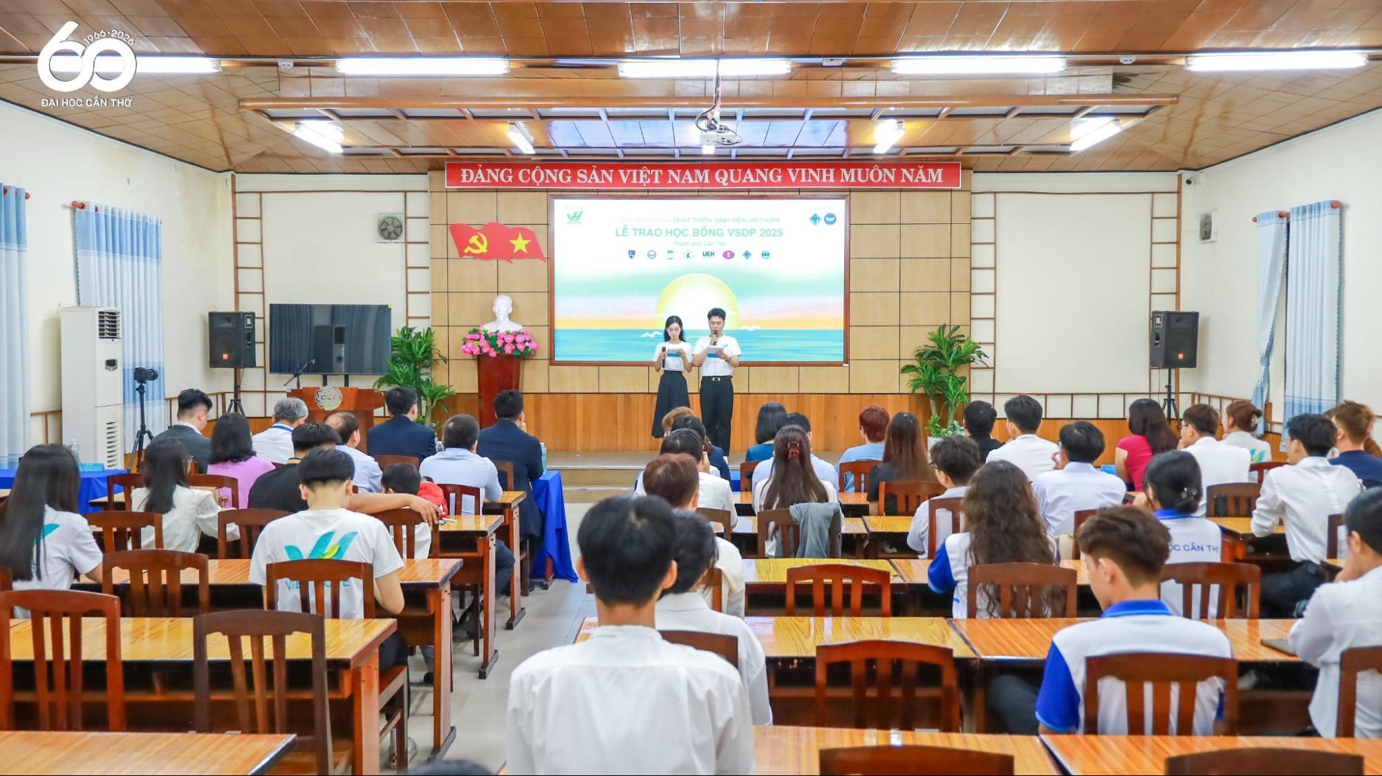 Tại Hội trường Trường Công nghệ Thông tin và Truyền thông, Đại học Cần Thơ (ĐHCT) đã tổ chức Lễ trao học bổng VSDP (VietHope Student Development Program - Chương trình Phát triển Sinh viên VietHope) năm 2025 dành cho sinh viên có hoàn cảnh khó khăn, nỗ lực vươn lên trong học tập. Chương trình nhằm kịp thời động viên, tiếp sức cho sinh viên trên hành trình học tập và phát triển bản thân, đồng thời thể hiện sự gắn kết giữa Nhà trường và các tổ chức xã hội trong công tác hỗ trợ người học.
