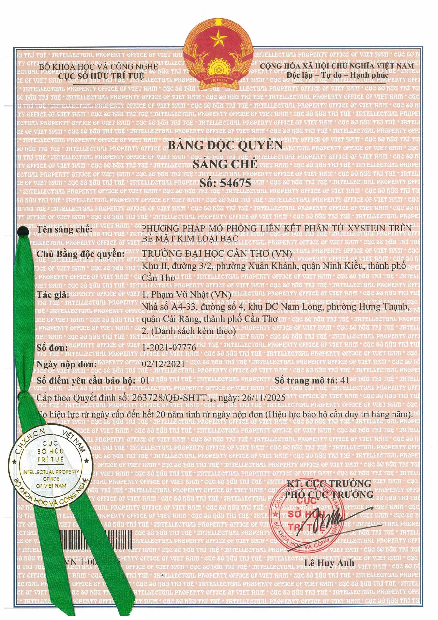 Bên cạnh đó, Đại học Cần Thơ cũng được cấp Bằng độc quyền Sáng chế số 54675 cho công trình “Phương pháp mô phỏng liên kết phân tử Xystein trên bề mặt kim loại bạc”. Nghiên cứu do nhóm tác giả gồm GS.TS. Nguyễn Thành Tiên, PGS.TS. Phạm Vũ Nhật, TS. Phạm Thị Bích Thảo (Trường Khoa học Tự nhiên) và PGS.TS. Đặng Minh Triết (Trường Sư phạm) thực hiện. Sáng chế mang giá trị khoa học cao, mở ra nhiều triển vọng ứng dụng trong lĩnh vực vật liệu nano, hóa học tính toán và công nghệ sinh học.