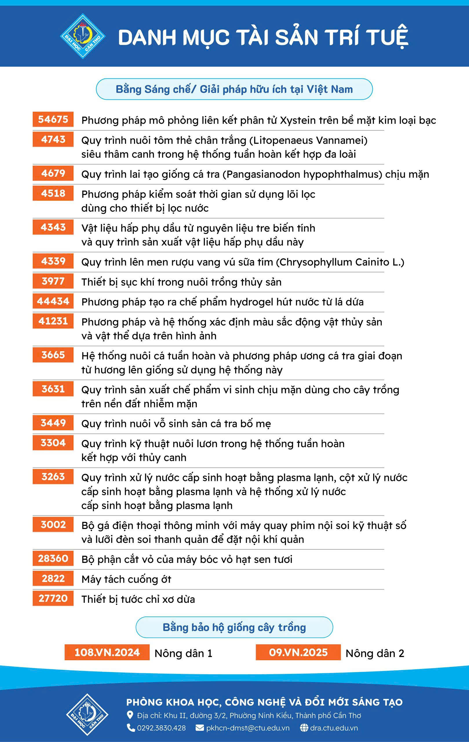 Tính đến nay, tổng số Bằng độc quyền Sáng chế và Giải pháp hữu ích do Đại học Cần Thơ sở hữu đã nâng lên 18 bằng, cùng với 02 bằng bảo hộ giống cây trồng. Đây là minh chứng thuyết phục cho năng lực nghiên cứu, đổi mới sáng tạo và chuyển giao công nghệ của Nhà trường trong nhiều lĩnh vực trọng điểm.