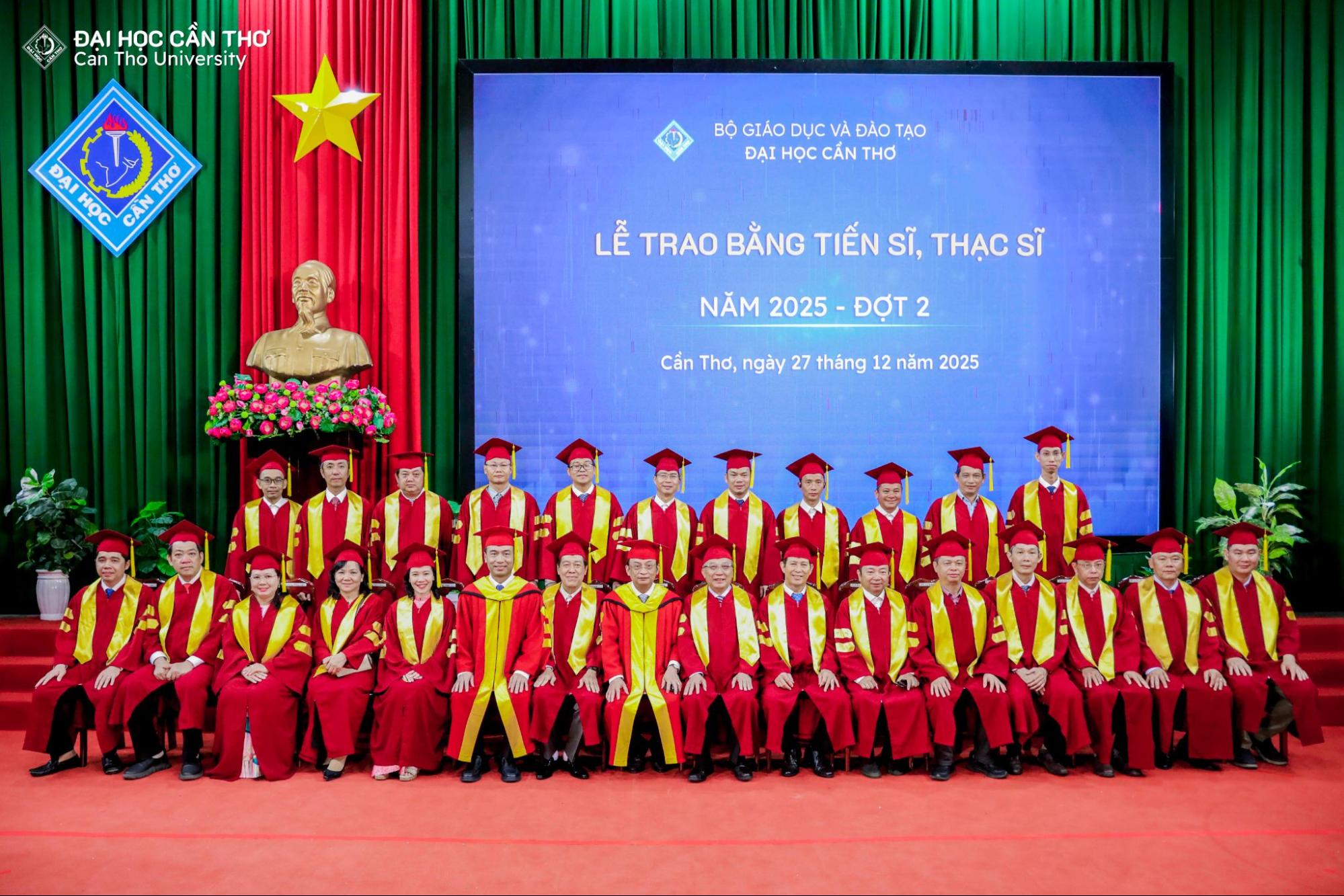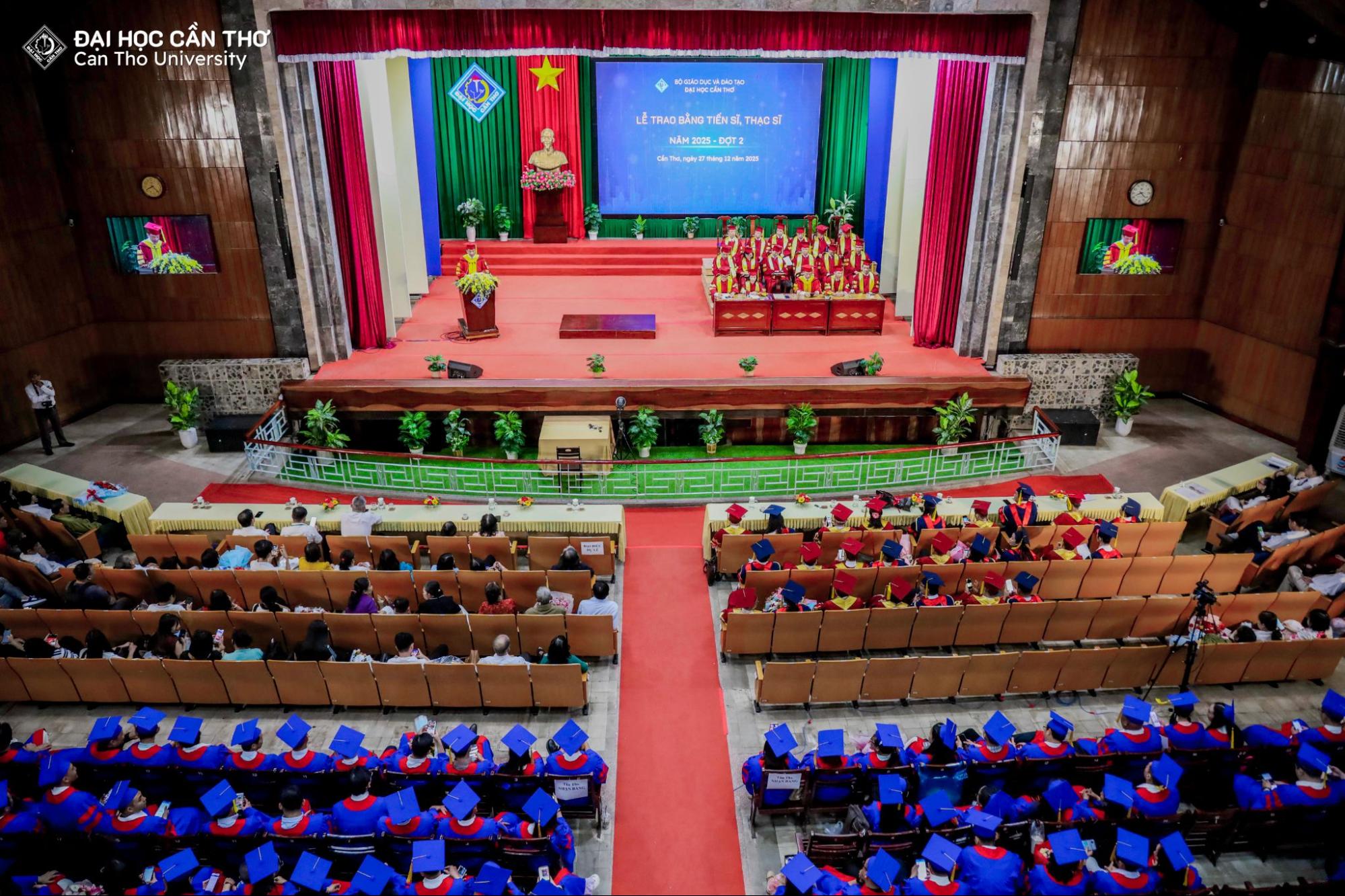 Sáng ngày 27/12/2025, Đại học Cần Thơ (ĐHCT) long trọng tổ chức Lễ trao bằng tốt nghiệp tiến sĩ, thạc sĩ đợt 2 năm 2025 cho 15 tân tiến sĩ và 468 tân thạc sĩ đủ điều kiện tốt nghiệp. Chương trình được diễn ra trong không khí trang trọng, ấm áp và đầy ý nghĩa tại Hội trường Rùa; đánh dấu một cột mốc quan trọng trong hành trình học thuật của các nghiên cứu sinh, học viên cao học.