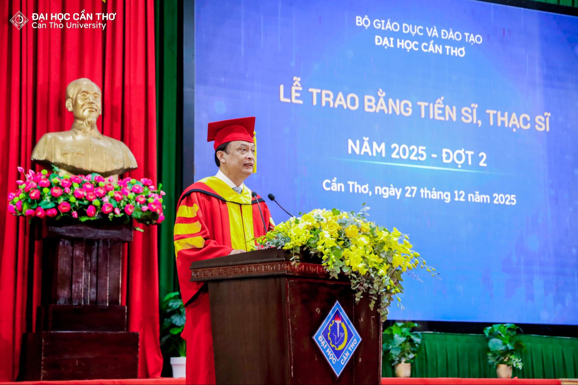 Lễ trao bằng tốt nghiệp không chỉ là sự kiện ghi nhận kết quả học tập và nghiên cứu của người học sau đại học, mà còn là dịp để tôn vinh tinh thần bền bỉ, khát vọng tri thức và trách nhiệm học thuật mà các tân khoa đã theo đuổi trong suốt quá trình đào tạo. Mỗi tấm bằng được trao là kết tinh của nỗ lực cá nhân, sự đồng hành tận tâm của đội ngũ giảng viên, cùng môi trường học thuật nghiêm túc, chuẩn mực mà ĐHCT không ngừng vun đắp. Đối với các tân tiến sĩ, thạc sĩ, đây không phải là điểm kết thúc, mà là bước khởi đầu cho hành trình cống hiến tri thức, lan tỏa giá trị học thuật và đóng góp thiết thực cho xã hội. Về phía ĐHCT, thành công của người học chính là minh chứng rõ nét cho chất lượng đào tạo và là động lực để Nhà trường tiếp tục kiên định với con đường phát triển bền vững, lấy tri thức làm nền tảng và con người làm trung tâm.