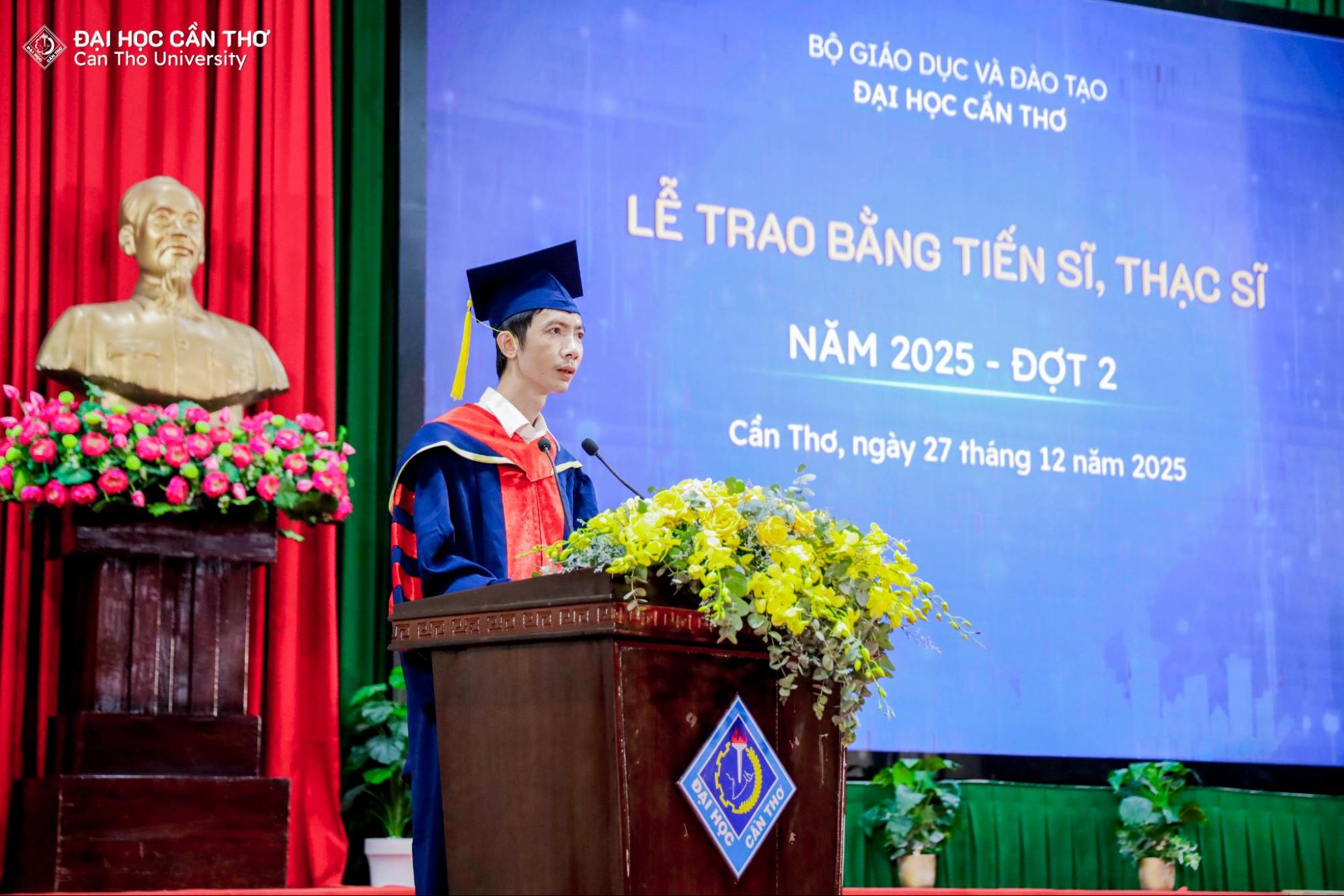 Tân tiến sĩ Nguyễn Tí Hon ngành Hệ thống thông tin Khóa 2020 đại diện cho 468 thạc sĩ và 15 tiến sĩ phát biểu cảm nghĩ tại buổi lễ và nhấn mạnh “Đại học Cần Thơ không chỉ là nơi chắp cánh cho những ước mơ học thuật, mà còn là ngôi nhà thứ hai, nơi chúng em đã trưởng thành và tìm thấy ý nghĩa đích thực của sự học và cống hiến. Tin chắc rằng các tân tiến sĩ, tân thạc sĩ ngày hôm nay luôn tự hào là một phần nhỏ bé trong hành trình đầy ý nghĩa của Đại học Cần Thơ, và từ đây, chúng em sẽ mang theo niềm tự hào ấy để tiếp tục đóng góp sức mình cho cộng đồng và xã hội”