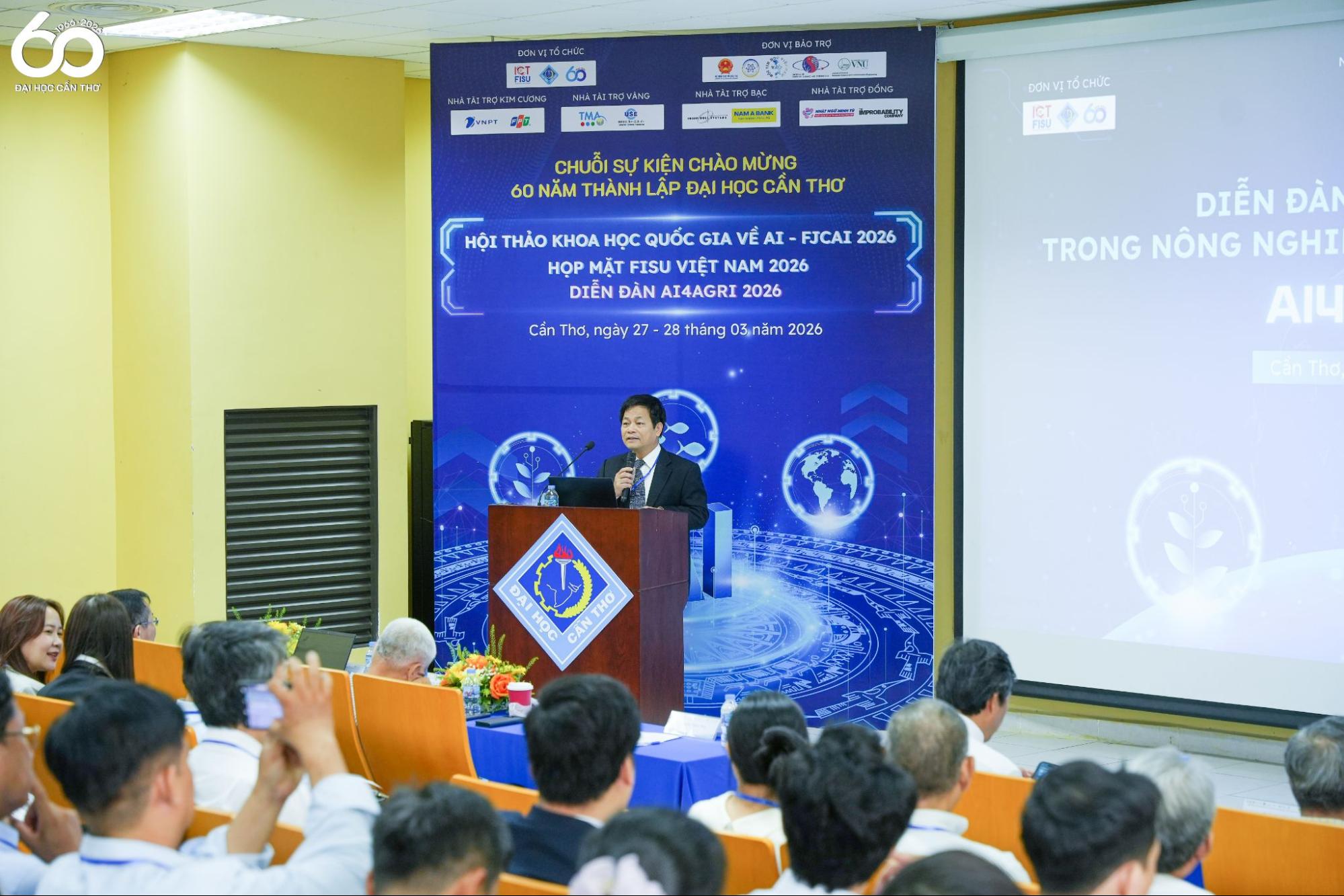 Trong khuôn khổ chuỗi Hội thảo khoa học Quốc gia về Trí tuệ nhân tạo (FJCAI 2026), sáng ngày 28/3/2026, Diễn đàn “Trí tuệ nhân tạo trong Nông nghiệp, Thủy sản và Môi trường” (AI4AGRI 2026) được Đại học Cần Thơ (ĐHCT) phối hợp cùng Câu lạc bộ Khoa – Trường – Viện Công nghệ Thông tin và Truyền thông (FISU) Việt Nam tổ chức. Đây không chỉ là một diễn đàn học thuật mang tính định hướng mà còn là không gian kết nối đa phương giữa nhà quản lý, nhà khoa học và doanh nghiệp, nhằm tìm kiếm những giải pháp công nghệ đột phá, giải quyết các thách thức đặc thù của vùng Đồng bằng sông Cửu Long.