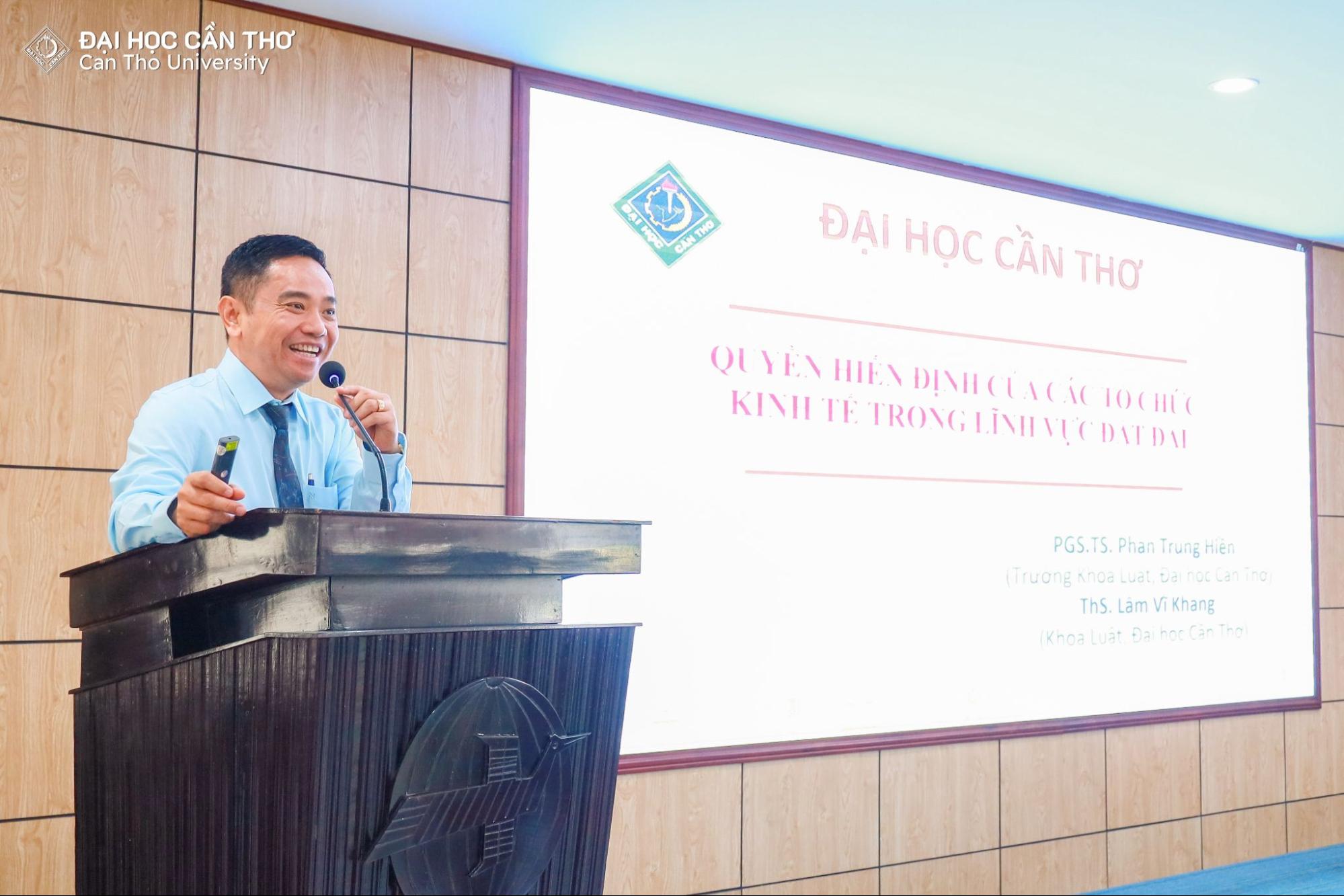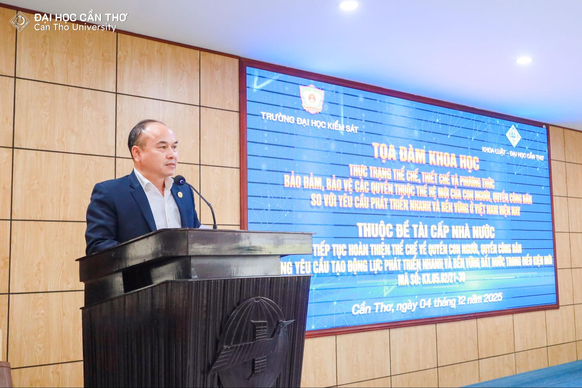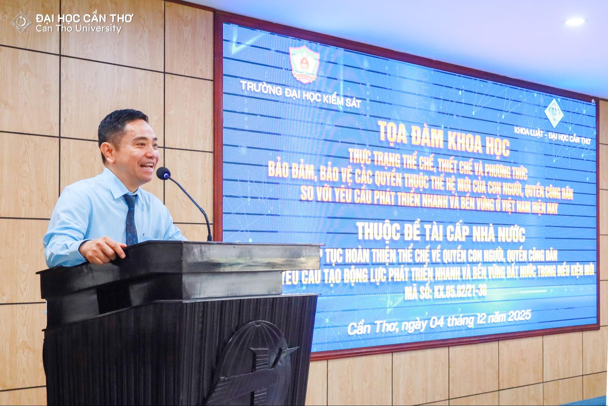 Phát biểu tại tọa đàm, PGS.TS. Phan Trung Hiền bày tỏ vinh dự khi phối hợp cùng Trường Đại học Kiểm sát tổ chức sự kiện khoa học cấp quốc gia tại ĐHCT. Ông cho biết Khoa Luật, được thành lập từ năm 2000 và đã hơn hai thập kỷ đào tạo nguồn nhân lực pháp lý chất lượng cao cho khu vực Đồng bằng sông Cửu Long, đang hướng đến mục tiêu trở thành một trong những đơn vị đào tạo luật uy tín hàng đầu cả nước. Việc đồng đăng cai tọa đàm với chủ đề về thể chế và quyền con người là minh chứng cho nỗ lực của Khoa Luật trong thúc đẩy nghiên cứu, chuyển giao tri thức và đóng góp cho quá trình hoàn thiện hệ thống pháp luật. Ông trân trọng ghi nhận sự tham gia của các nhà khoa học hàng đầu và tin tưởng rằng những kết quả thảo luận sẽ góp phần thiết thực vào việc bảo đảm, bảo vệ quyền con người và quyền công dân ở Việt Nam.