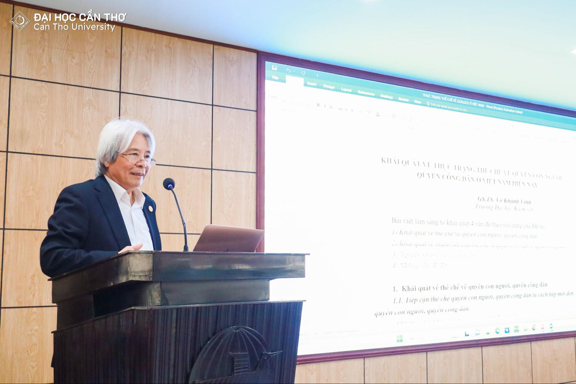 GS.TS. Võ Khánh Vinh trình bày tham luận “Khái quát thực trạng thể chế về quyền con người, quyền công dân và thực tiễn thực hiện so với yêu cầu phát triển nhanh và bền vững đất nước trong giai đoạn hiện nay”