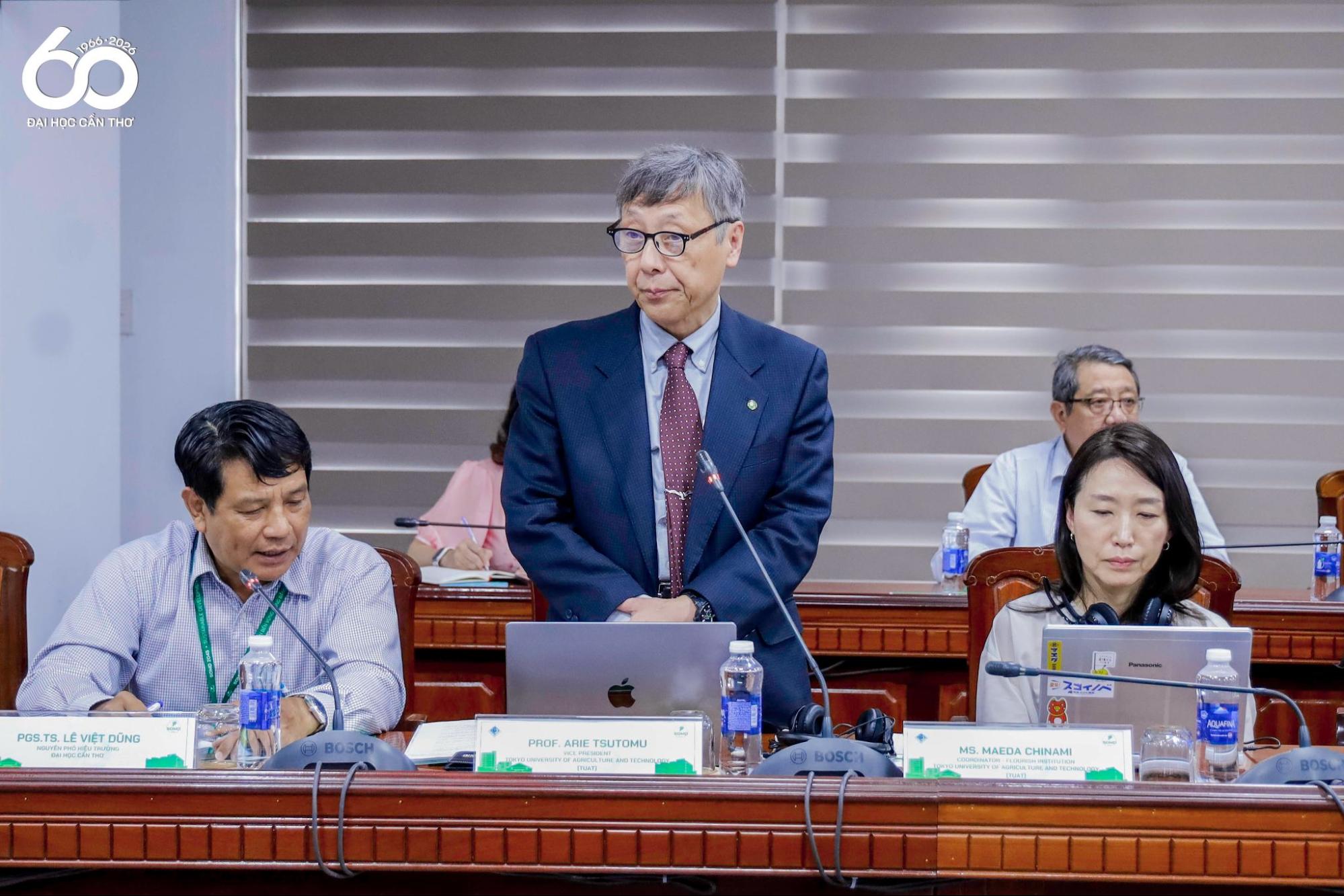 Từ góc nhìn hợp tác quốc tế, GS. Arie Tsutomu - Phó Hiệu trưởng Đại học Nông nghiệp và Công nghệ Tokyo (TUAT) chia sẻ kinh nghiệm về mô hình hợp tác đa phương giữa các bên trong nước và quốc tế nhằm thúc đẩy phát triển bền vững vùng, nhấn mạnh vai trò trung tâm của các trường đại học trong việc kết nối tri thức toàn cầu, thúc đẩy chuyển giao công nghệ và hình thành các mạng lưới nghiên cứu liên ngành