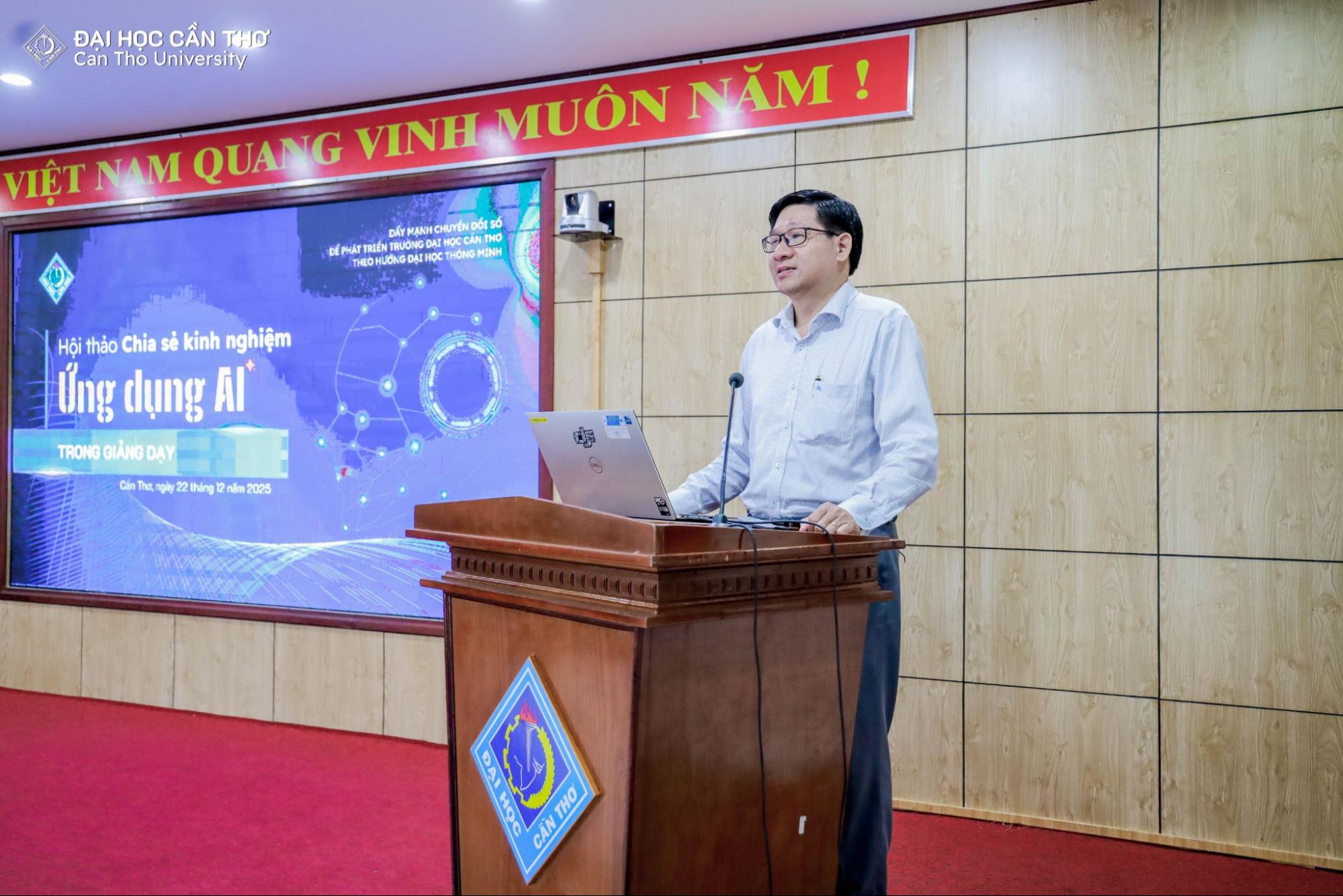 Hội thảo chuyên đề chia sẻ kinh nghiệm về ứng dụng AI trong giảng dạy diễn ra vào ngày 22/12/2025 với 04 tham luận chính, làm rõ vai trò của trí tuệ nhân tạo trong hỗ trợ giảng viên, đổi mới thiết kế dạy học và đánh giá người học. Các tham luận tập trung vào các nội dung: “Ứng dụng trí tuệ nhân tạo tạo sinh trong giảng dạy đại học: Từ hỗ trợ giảng viên đến đổi mới thiết kế dạy học và đánh giá”; “Khảo sát và đánh giá năng lực trí tuệ nhân tạo của giáo viên phổ thông Cần Thơ theo khung của UNESCO”; “Ứng dụng trí tuệ nhân tạo trong hiệu chỉnh đề cương chi tiết học phần Triết học Mác - Lênin, tạo sự gắn kết giữa chuẩn đầu ra với phương pháp giảng dạy và đánh giá”; “Kinh nghiệm ứng dụng AI trong thiết kế đề thi: Từ quy trình, tiêu chí đánh giá đến kiểm soát hiện tượng ảo giác của AI”.