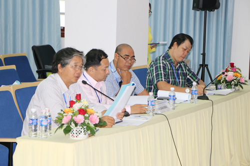 Ban Giám khảo (từ trái qua) gồm: ông Trần Hoàng Tuyên, Trung tâm Nghiên cứu kinh doanh và Hỗ trợ doanh nghiệp, và PGS.TS. Nguyễn Minh Chơn, Viện NC&PT Công nghệ sinh học; PGS.TS. Lê Nguyễn Đoan Khôi, Phòng Quản lý Khoa học; TS. Trịnh Quốc Lập, Khoa Ngoại ngữ (Trường ĐHCT) |