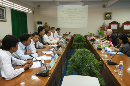 Sáng ngày 14/03/2012, Trường Đại học Cần Thơ (ĐHCT) đã vinh dự đón tiếp đoàn Lãnh sự Úc do ông John McAnulty Am - Tổng lãnh sự dẫn đầu tại Hội trường Ban Giám hiệu. Phó Hiệu trưởng Đỗ Văn Xê đại diện Ban Giám hiệu Trường ĐHCT cùng đại diện lãnh đạo Phòng Hợp tác Quốc tế, Khoa Thủy sản, Khoa Môi trường và Tài nguyên thiên nhiên (MT&TNTN), Khoa Sư phạm, Viện Nghiên Cứu Biến đổi Khí hậu và Viện Nghiên cứu Phát triển Đồng Bằng Sông Cửu Long (NCPT ĐBSCL) đã tiếp đoàn công tác. Trong chuyến thăm này, đoàn công tác Lãnh sự Úc đã dự buổi đón tiếp và sau đó được tiếp đón tham quan tại các đơn vị liên quan.